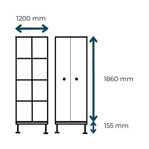Dans l’armoire collective dotée de 8 cases, une case ou un compartiment standard, est dimensionné de la manière suivante : hauteur de 455 mm, largeur 590 mm et profondeur 500 mm. Chaque rangement individuel correspond à un volume de stockage d’environ 0,14 mètre cube.